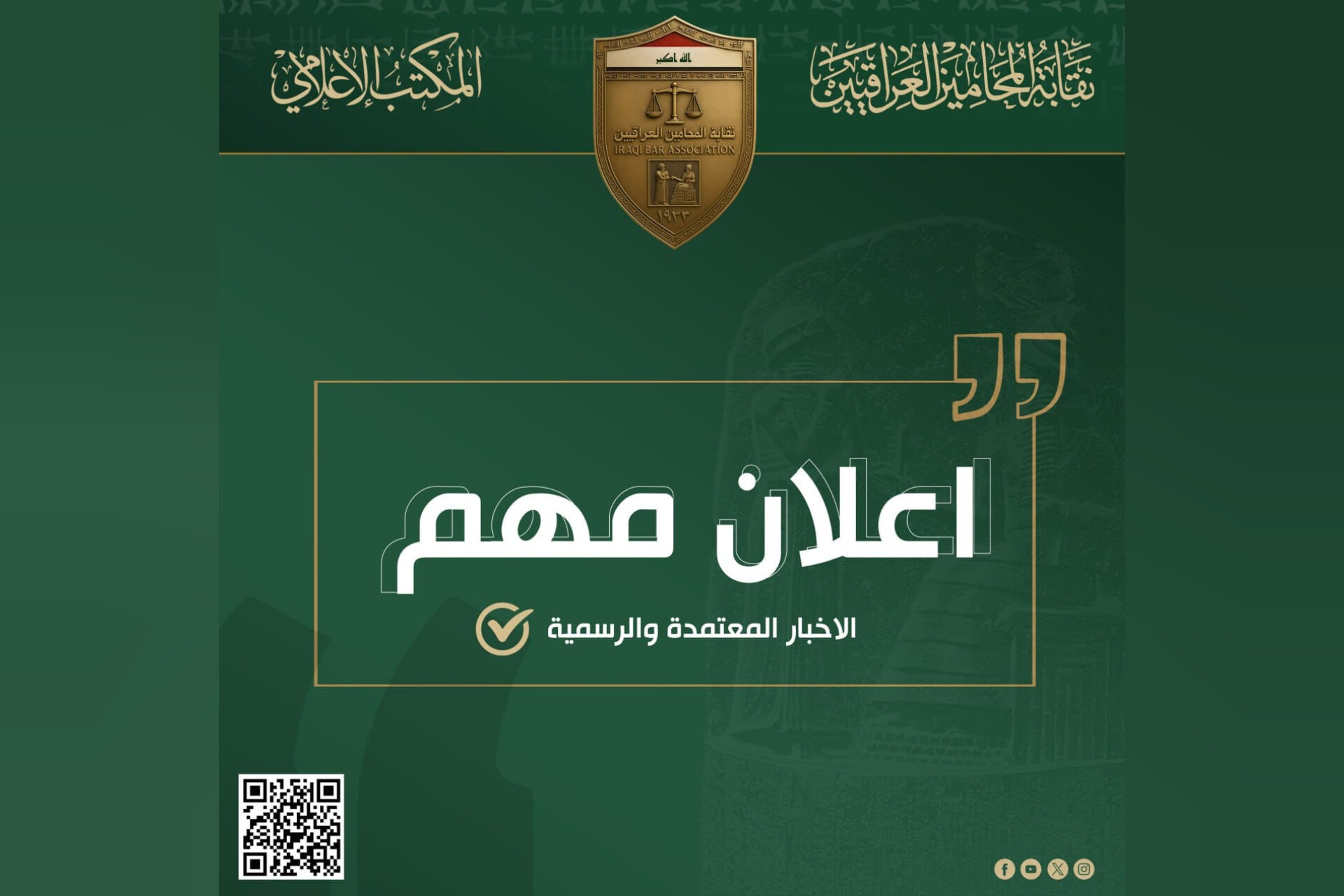 أمر إداري|| نقابة المحامين العراقيين تعطّل الدوام الرسمي في مقرّها، يوم الخميس ٢٥ / ١٢ / ٢٠٢٥، لإجراء انتخابات نقابة المبرمجين.