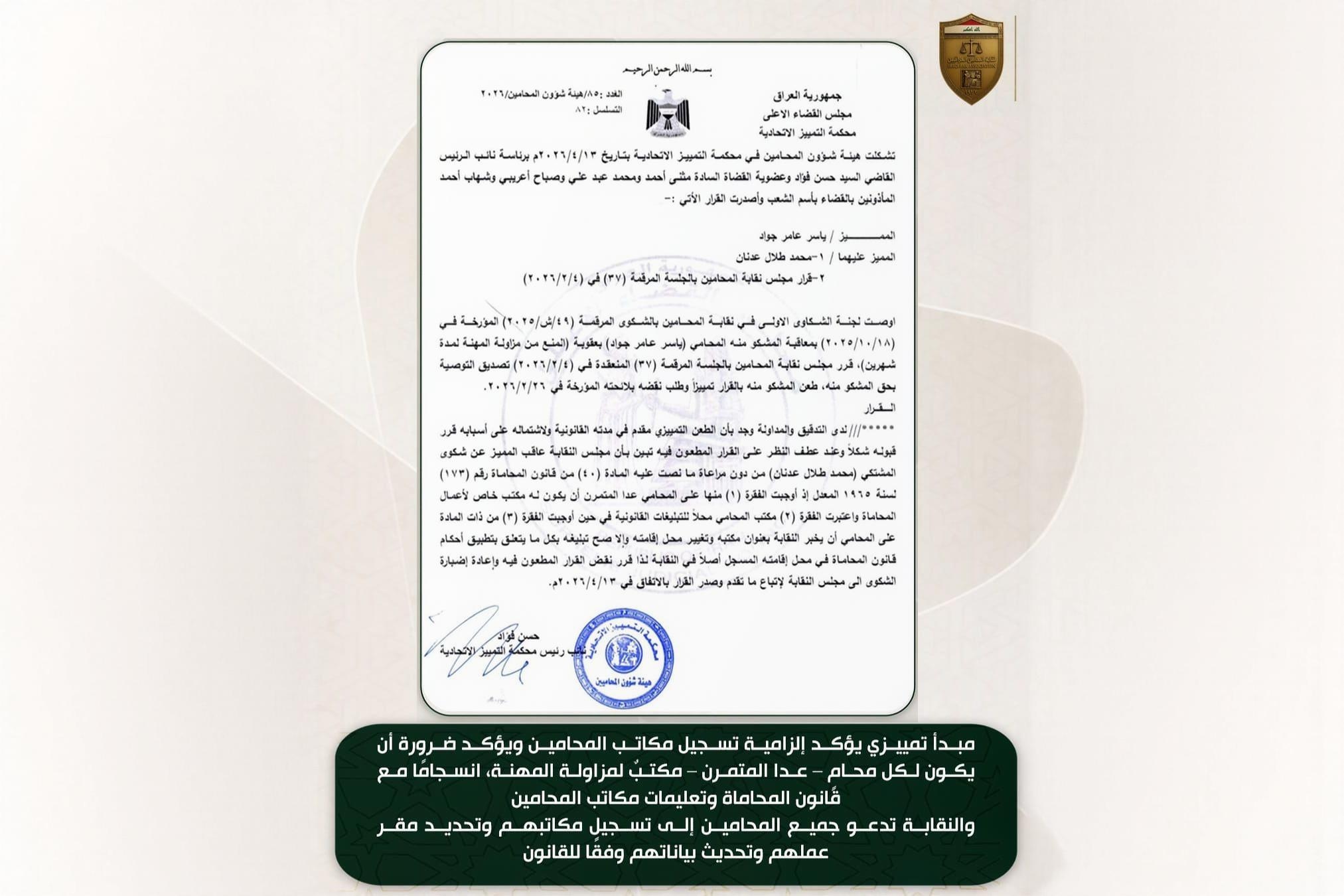 حفاظًا على هيبة المهنة وسمعة المحامين: نقيب المحامين العراقيين تصدر أمرًا إداريًا بشأن نشر العرائض والطلبات على مواقع التواصل ووسائل العلانية.