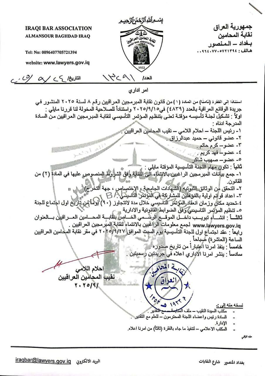 نقيب المحامين العراقيين أحلام اللامي تُشكّل اللجنة التحضيرية لعقد المؤتمر التأسيسي لنقابة المبرمجين العراقيين، استنادًا لقانونها رقم (٨) لسنة ٢٠٢٥.