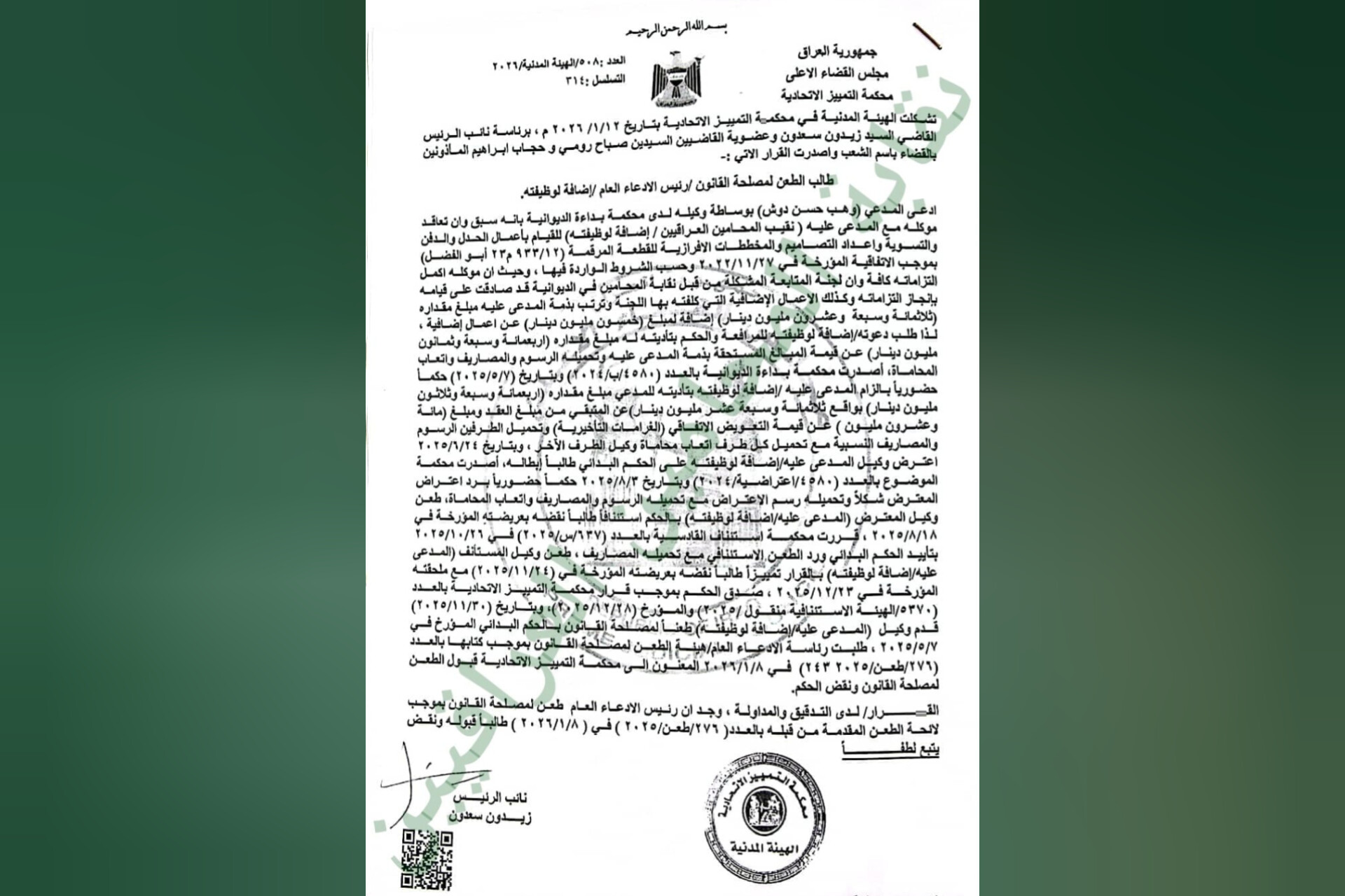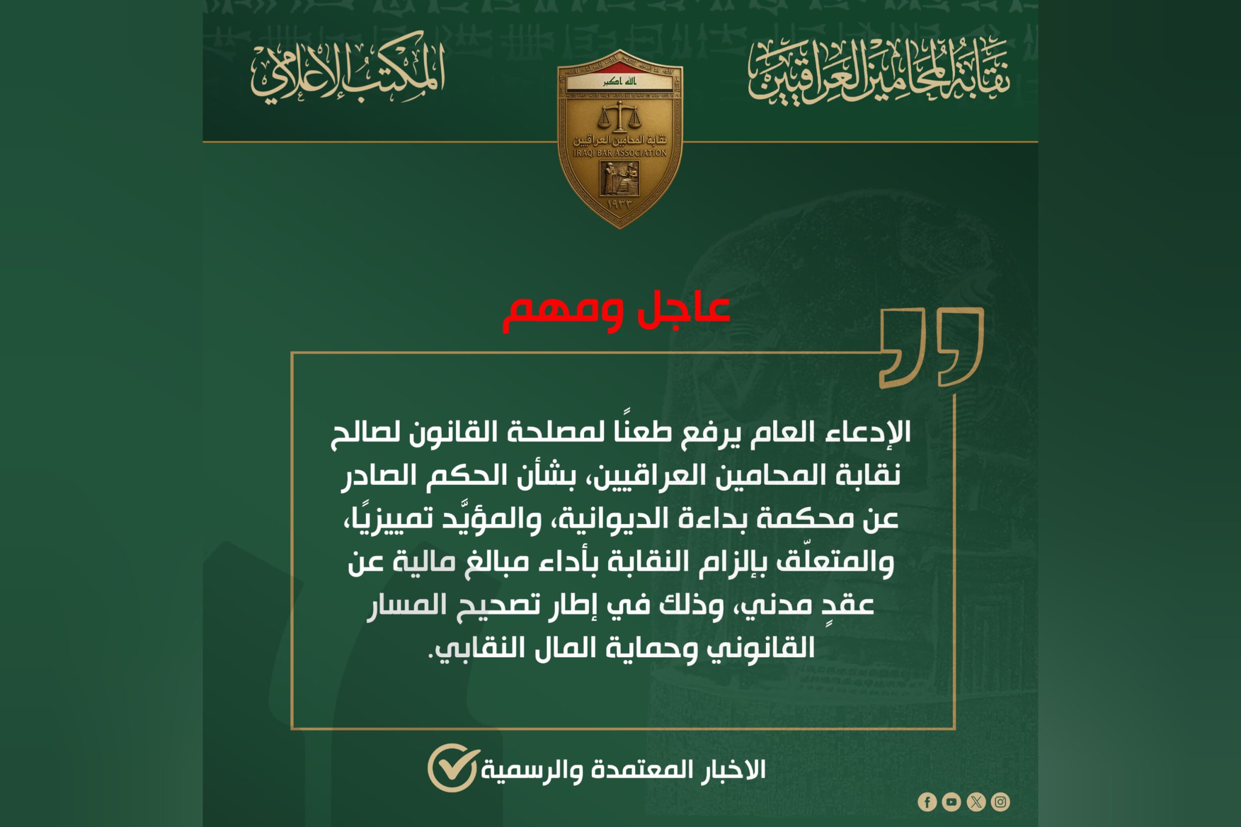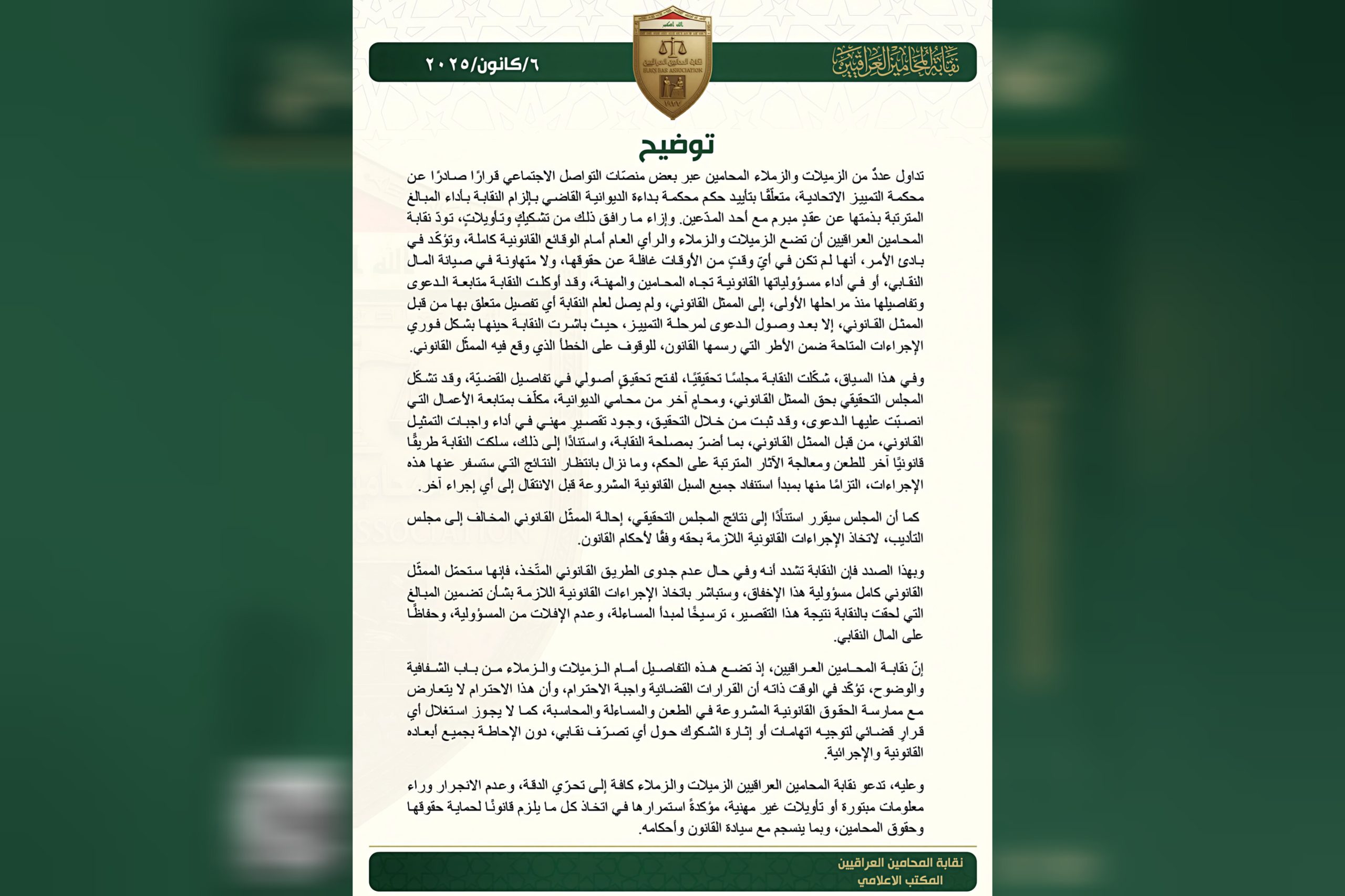 نقيب المحامين يتابع قضية احد المحامين الموقوفين في جنايات الرصافة