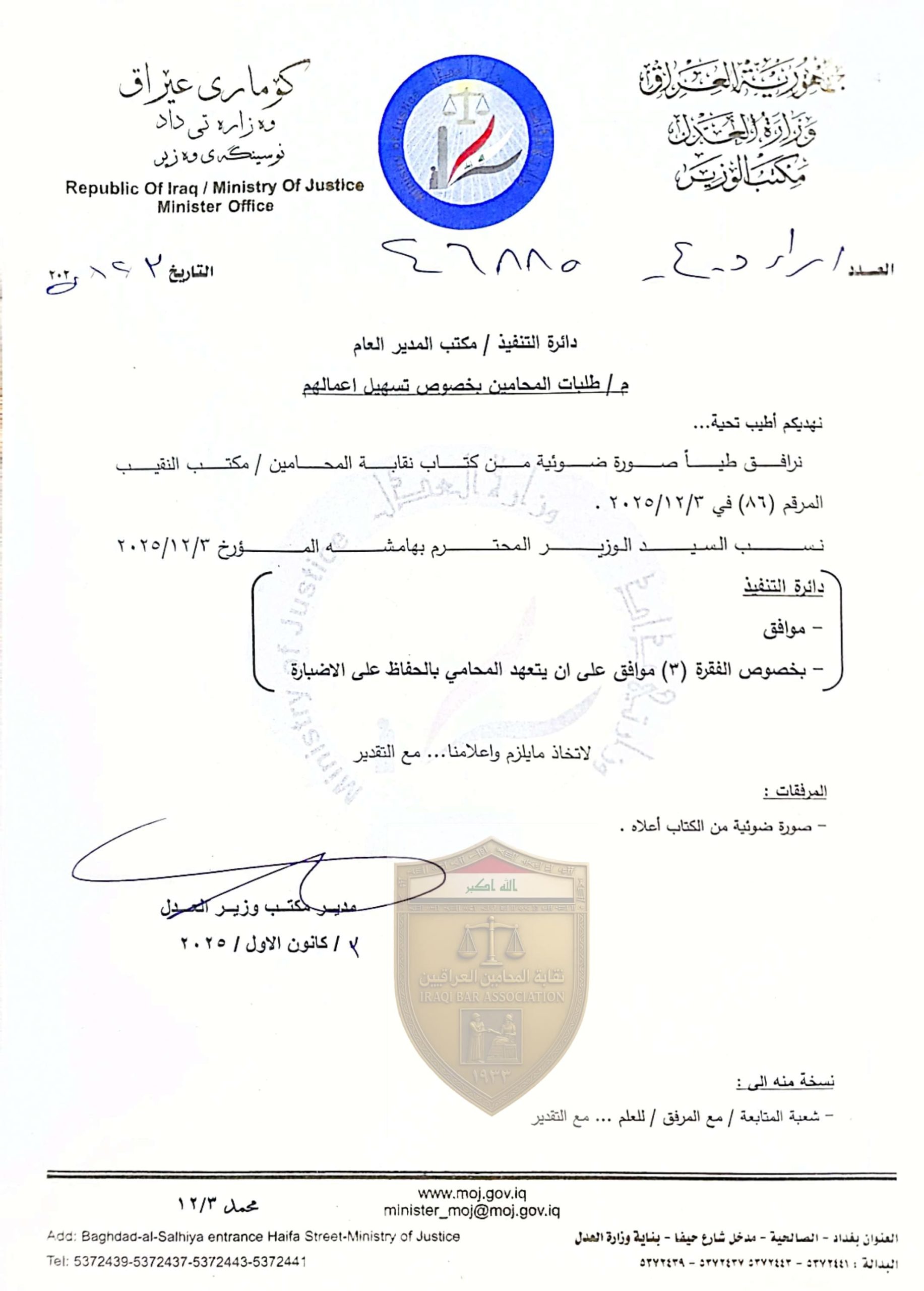 – السماح للمحامين باستلام الأضابير التنفيذية لإكمال الإجراءات داخل الدائرة، مع التعهّد بالمحافظة عليها.