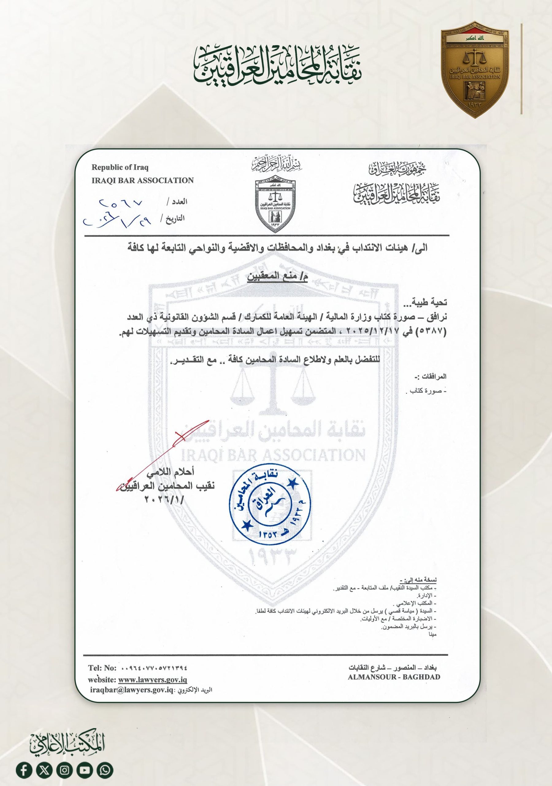 إعمام || الهيئة العامة للگمارك تعمم كتابها بمنع التعامل مع المعقبين وتسهيل مهام المحامين، والسيدة النقيب تعمم الكتاب على هيئات الانتداب كافة.