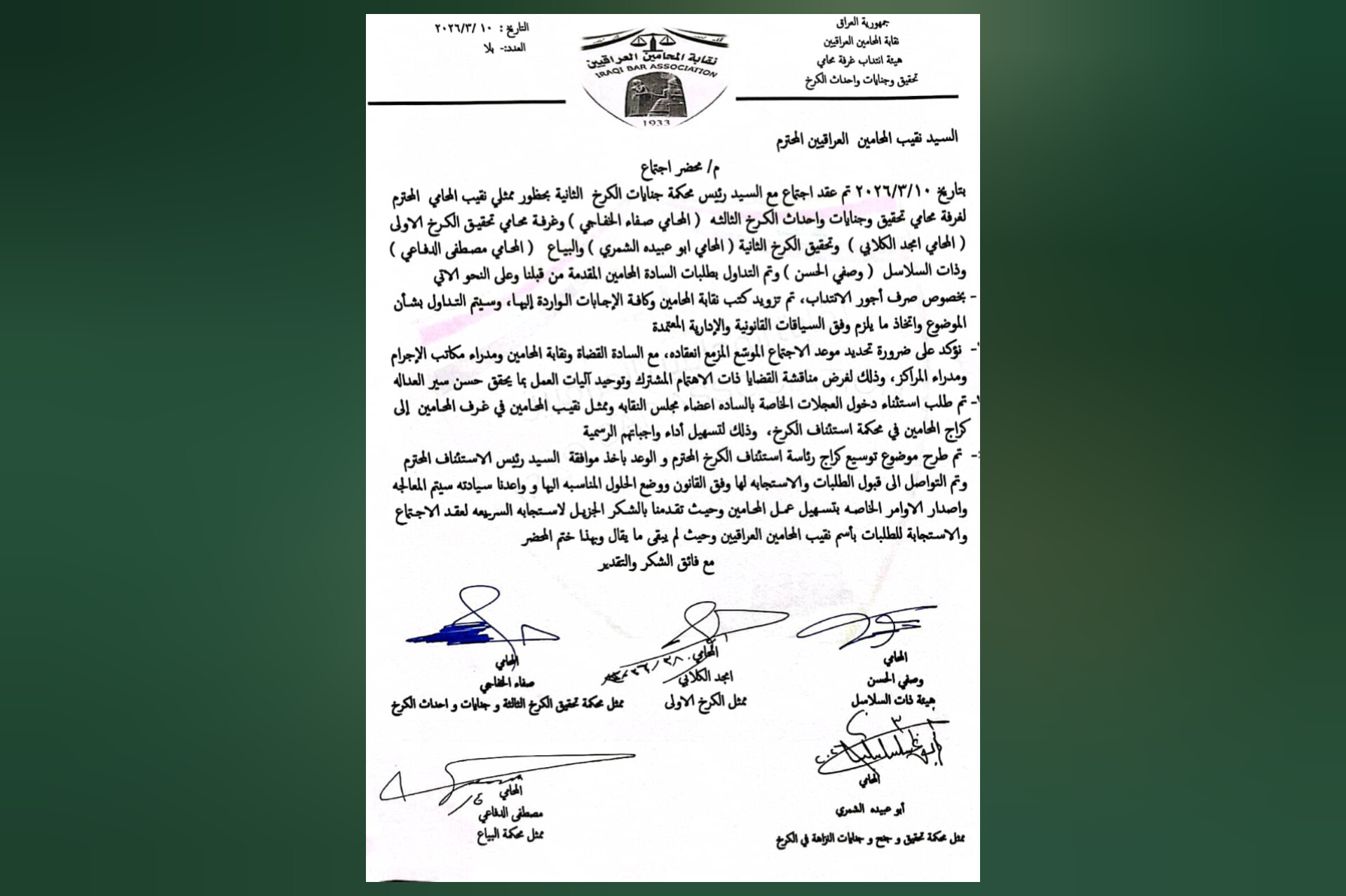 عُقد اجتماعٌ رسمي مع السيد رئيس محكمة جنايات الكرخ / الهيئة الثانية، بحضور عدد من رؤساء الغرف، وهم: المحامي صفاء سليم الخفاجي ممثل غرفة محامي الكرخ الثالثة، والمحامي أمجد الكلابي ممثل غرفة محامي الكرخ الأولى، والمحامي أبو عبيدة الشمري ممثل غرفة محامي الكرخ الثانية، والمحامي وصفي الحسن ممثل غرفة محامي ذات السلاسل، والمحامي مصطفى الدفاعي ممثل تحقيق البياع، والمحامي علي فيحان الدليمي.